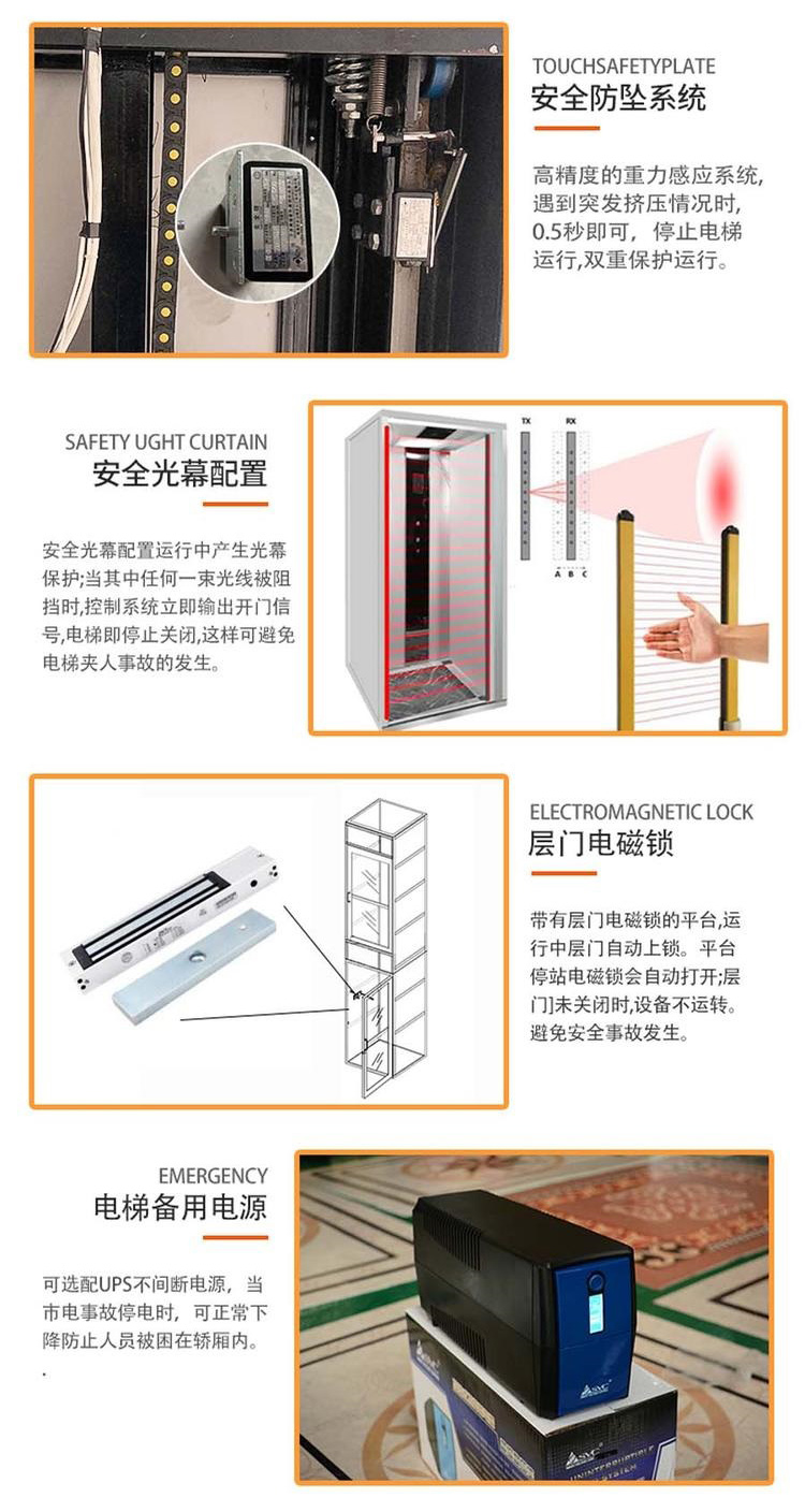 家用液壓電梯是靠液壓油缸頂升帶動(dòng)鏈條,鏈條帶動(dòng)轎廂上升,電梯控制系統(tǒng)裝有無機(jī)變速變頻器,電梯機(jī)械機(jī)構(gòu)設(shè)計(jì)合理、安全可靠、升降平穩(wěn)、采用油寖式合資靜音泵站,升降過程中無噪音、無頓挫感。開門斷電,轎門廳門雙重保護(hù)所以液壓式電梯的安全系數(shù)是比較高的,更不會(huì)發(fā)生轎廂沖頂失速下降等情況。在電梯停電時(shí)按一下轎廂內(nèi)的應(yīng)急按鈕,會(huì)接通回油閥,液壓油慢慢的到油后電梯會(huì)靠自重慢慢下降,??恐烈粚印?