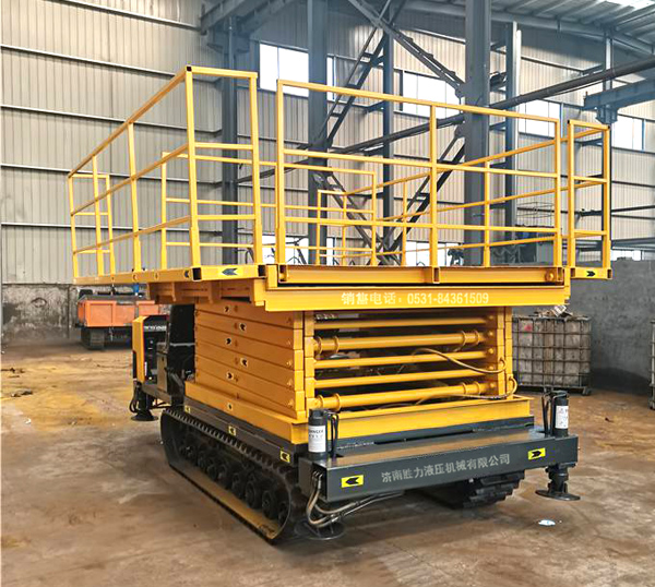 履帶式行走升降平臺采用加重底盤,工作時,不需要支腿,在升降機升起后,不需要把升降機收起即可行走,提高了工作效率。同時,它的履帶式車輪,增加了與大地接觸的面積,在野外泥濘道路上也可行走和工作,是石油勘探、野站部隊通信線路安裝施工等野外高空作業(yè)的理想設備。