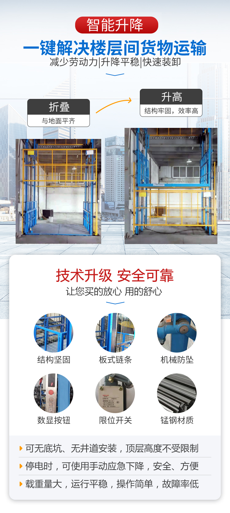 電動液壓升降貨梯安裝不受限制,無需地坑和井道,產(chǎn)品結(jié)構(gòu)堅固,載重量大,升降平穩(wěn),安裝維護簡單方便,是經(jīng)濟實用的低樓層間替代電梯的理想貨物輸送設(shè)備。