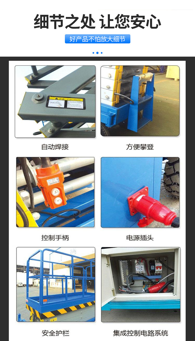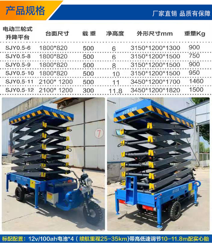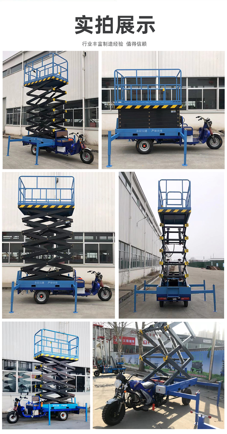 三輪車升降平臺剪叉式機械結(jié)構(gòu),使升降機起升后有較高的穩(wěn)定性。寬大的作業(yè)平臺和較高的承載能力,使高空作業(yè)范圍更大、并適合多人同時作業(yè)。移動剪叉式升降機具有移動靈活、升降平穩(wěn)、操作方便、載重量大等特點,被廣泛用于工廠、車間、機場、園林、車站、路燈維修、高速公路及建筑裝修等各種高空作業(yè)場所。
