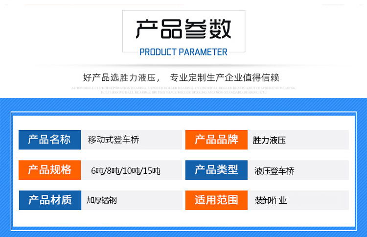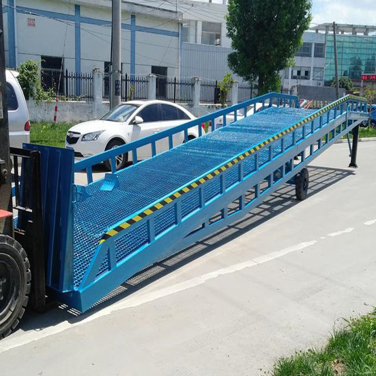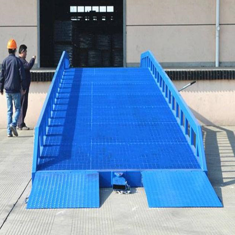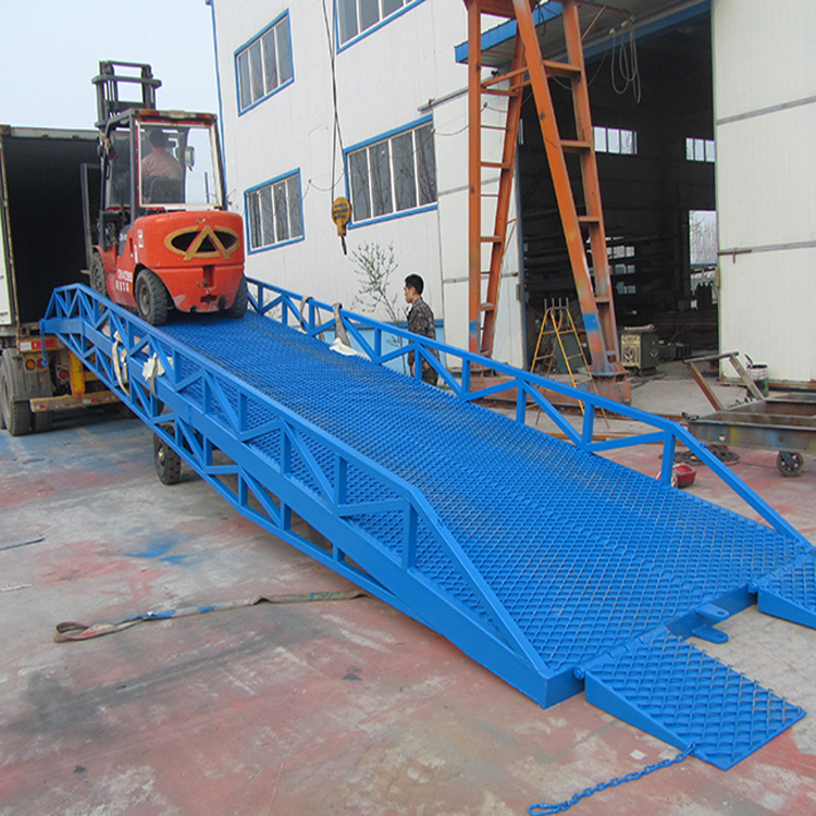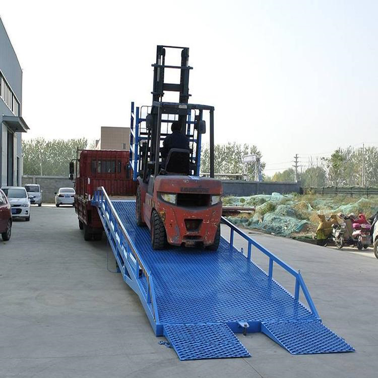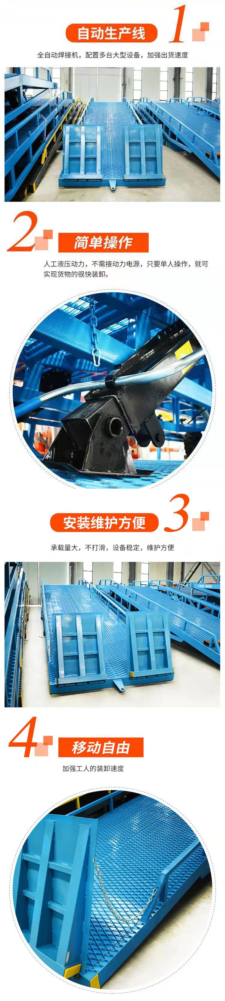 移動(dòng)式液壓登車(chē)橋是實(shí)現(xiàn)貨物快速裝卸的專用輔助設(shè)備,它的高度調(diào)節(jié)功能使貨車(chē)與庫(kù)房的貨臺(tái)之間架起一座橋梁,叉車(chē)等搬運(yùn)車(chē)輛通過(guò)它能直接駛?cè)胴涇?chē)內(nèi)部進(jìn)行貨物的批量裝卸,僅需單人作業(yè),即可實(shí)現(xiàn)貨物的快速裝卸。移動(dòng)式液壓登車(chē)橋使企業(yè)減少大量勞力,提高工作效率,獲取更大經(jīng)濟(jì)效益。臺(tái)面均設(shè)計(jì)為網(wǎng)格狀鋼板,這種結(jié)構(gòu)能保證具有很好的強(qiáng)度,又具有防滑功能,還能方便地清掃工作臺(tái)面,使它能經(jīng)常地保持清潔、美觀。移動(dòng)式登車(chē)橋無(wú)須外接電源,通過(guò)手搖泵做動(dòng)力能輕松地在其整個(gè)調(diào)整范圍內(nèi)按50mm的倍數(shù)進(jìn)行高度的調(diào)整??梢猿浞诌m應(yīng)各種不同高度的貨車(chē).