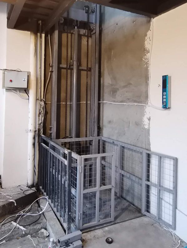 小型單軌式液壓升降貨梯是由導(dǎo)軌、臺面、鏈條、油缸、泵站、控制系統(tǒng)等組合而成的一種常見的液壓貨梯。